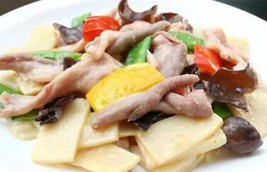 3、锅加油烧6成热时,倒入肉丝煸炒至白色,加入姜、葱爆香。