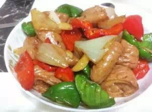 5、然后放青红辣椒片,最后浇点水淀粉出锅。