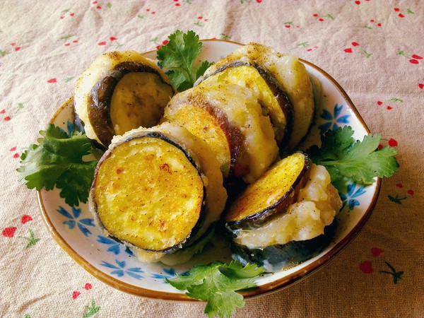 5.锅烧热下适量油,下入裹好面糊的茄盒中小火煎,一面的面糊定型后再翻面煎另一面,然后再翻过来将表面煎至金黄即可。出锅装盘撒上椒盐即可