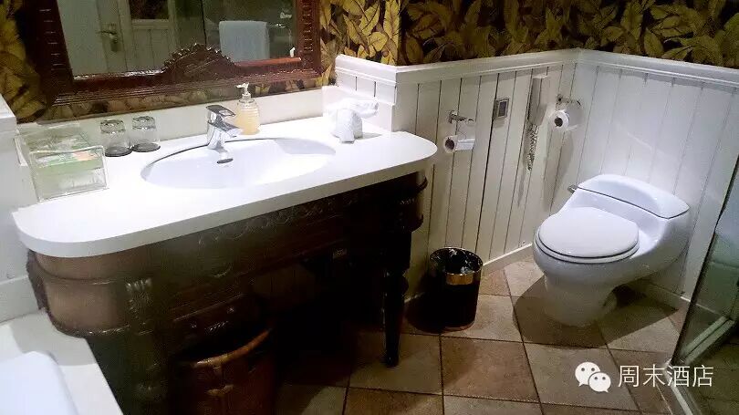 “酒店的房间略萌,带点卡通的轻复古和温馨的欧式童话风。尽管整个酒店看上去略显陈旧,但完全不妨碍我对房间的喜爱。色调是高贵大气的棕色,家具表面没有用特别亮的油漆涂刷,而是印出了木质原有的色泽感,顿时觉得质感高了许多,墙纸的图案略带雨林色,也很好地体现了酒店整体雨林的风格,又不显突兀。开放式的卫浴贴心地准备了帘子,还有卫浴专用音乐播放,可以避免使用时的尴尬。卫浴中还有节能声控灯,三分钟后自动关闭,非常节能。”