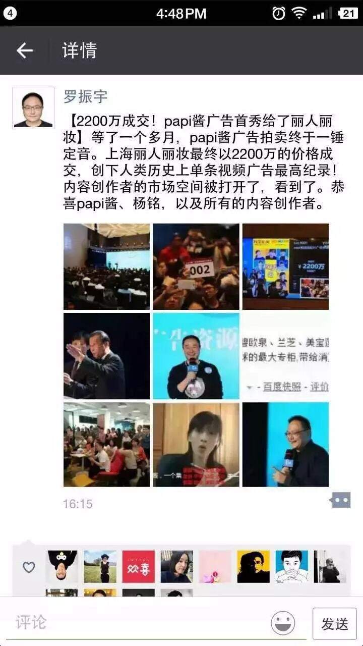 就刚刚,我发了个朋友圈,照片里是所谓的“新媒体标王”papi酱的第一次贴片广告拍卖会,上海丽人丽妆用2200万拍下了这个标王。结果好多人回复,有表示不解的,有吐槽的,有默默点赞的(点赞是几个意思?)