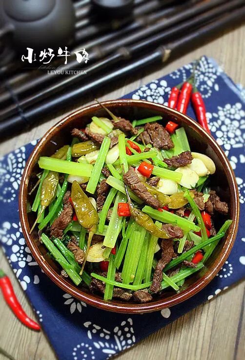 2、 牛肉切丝、芹菜切段。红辣椒切段,蒜切片。