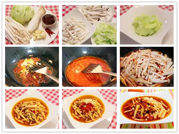 第一步:准备食材。主料:白玉菇一包、杏鲍菇一根、生菜一棵。辅料:豆瓣酱一大勺、大蒜几瓣、干辣椒几个。