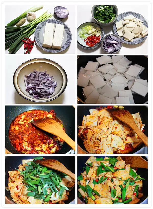 第二步:将千叶豆腐切成片、青蒜苗切段、洋葱切丝、红辣椒段切、葱姜蒜切末备用。