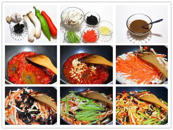 第二步:将杏鲍菇切丝、胡萝卜切丝、尖椒切丝、木耳泡发后切丝、葱姜蒜切末备用。