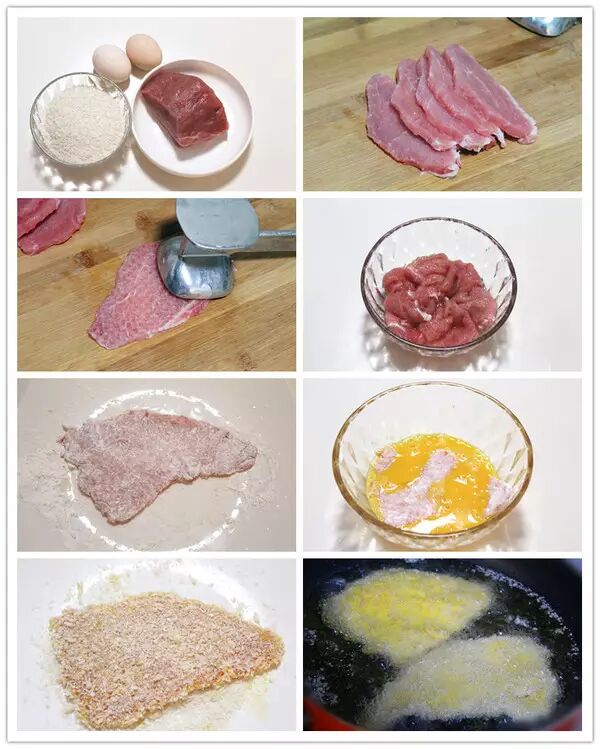 第八步:平底锅中倒入食用油,油烧到六成热的时候,将肉排放入锅中,中火炸至表面金黄时捞出。待全部炸完后,将油温再烧高一点,然后所有猪排再次放入锅中,快炸三十秒捞出,沥干油份,切成小块即可食用。