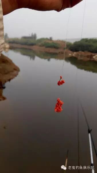 钓饵:老鬼九一八4#(30%)+巨鲤草(30%)+拉丝粉10%;因河中有鲤鱼故另加鲤鱼饵30%。
