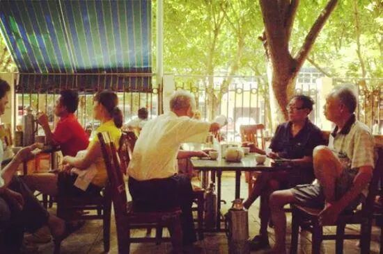 “老爸”在海口话里是指中老年人,一壶茶,一碟花生,或一二个面包,陈旧的桌凳,围着三两个打扮朴素的茶客,闲闲静静地“吃”着茶。