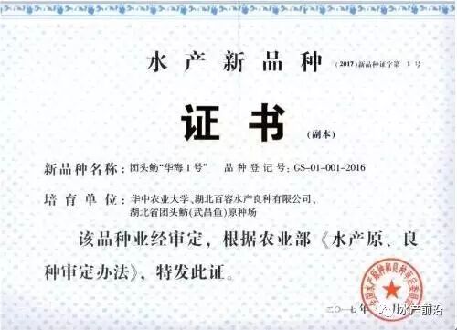 王卫民:团头鲂“华海1号”新品种是以梁子湖、淤泥湖和鄱阳湖团头鲂野生群体,作为选育的基础群体,采用家系选育和群体选育,结合亲子鉴定技术,以生长速度和成活率为目标性状,经连续4代选育,培育成遗传稳定、生长快、成活率高的团头鲂新品种,暂定名为团头鲂“华海1号”。