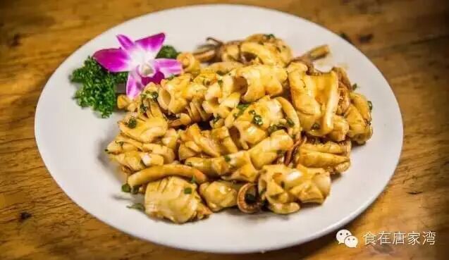 将鱿鱼切片,适当的火候焗得鱿鱼外焦里脆的,外面看似“焦”,吃起来却不焦,豉油将鱿鱼的味道衬托得更加鲜甜了。