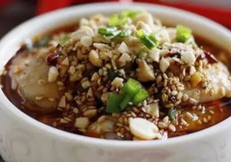 3、在大钵中放入盐、味精、白糖、酱油、醋、炒过的姜蒜豆豉、红油辣椒、花椒油、香油、油炸花生仁搅拌均匀兑成调味汁。