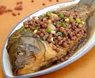 原料:鲤鱼1条、泡好的红小豆150克、油、生姜5片、蒜片、葱结1个、淀粉、陈醋、酱油、盐、料酒、葱花