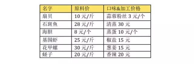 所有的加工店都是直接收取加工费用,按海鲜品种不同,有的按“斤两”收费,有的按“个”收费。每家店收费标准大同小异,淡旺季差别也不是很大,以下价格仅供参考: