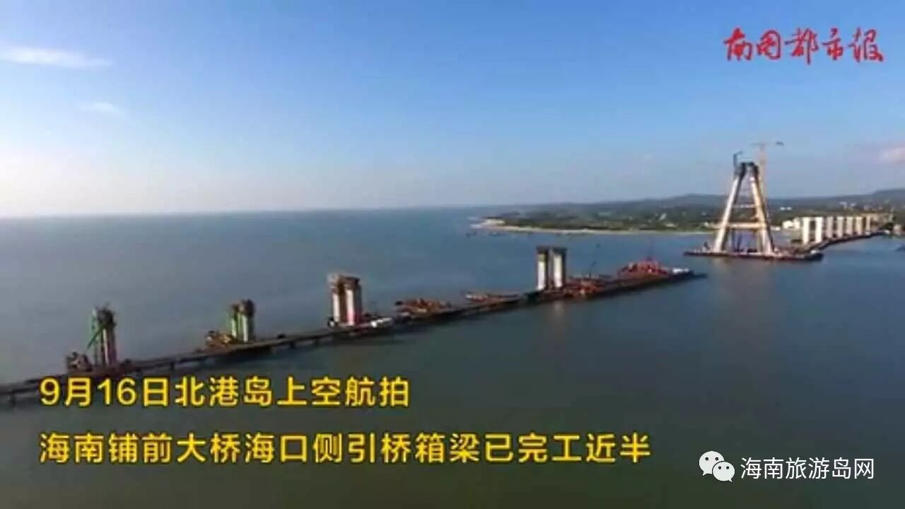 9月16日,在北港岛上空航拍,海南铺前大桥海口侧引桥箱梁已完工近半,由中交一公局承建的海南铺前大桥第一合同段海口侧引桥左幅箱梁已施工19跨,右幅箱梁已施工13跨,合计已完工32跨,完成总量跨数45%。