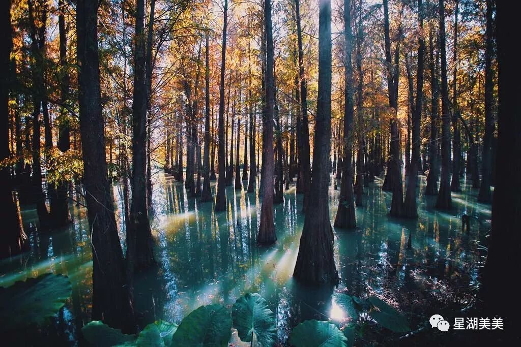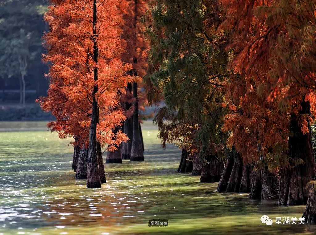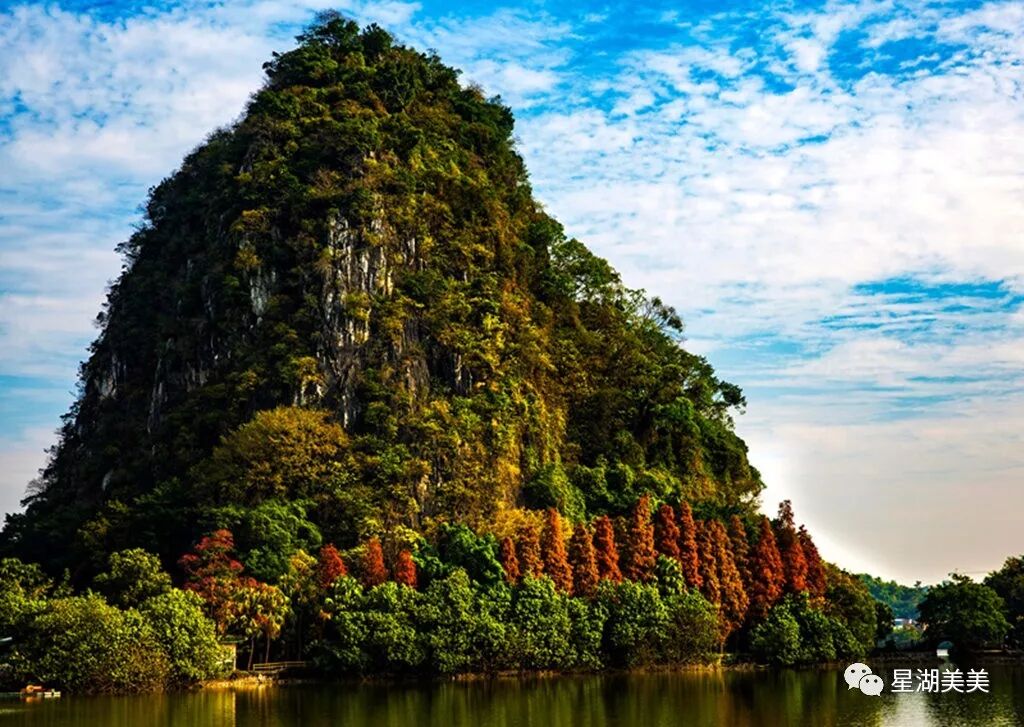 七星岩的落羽杉林,堪称中国南方最美的落羽杉林,其树形优美,羽毛状的叶丛极为秀丽,入秋后树叶会根据空气的温度变化而变色。