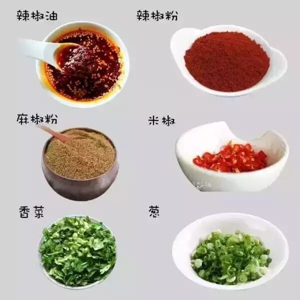 配料:辣椒油、辣椒粉、麻椒粉、小米椒、香菜、葱花