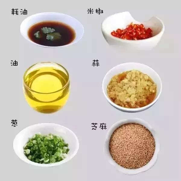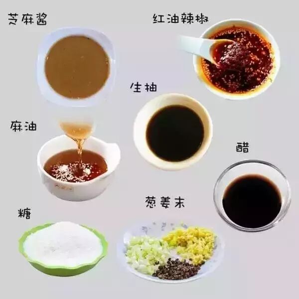 配料:芝麻酱、红油辣椒、麻油、生抽、糖、醋、葱姜末