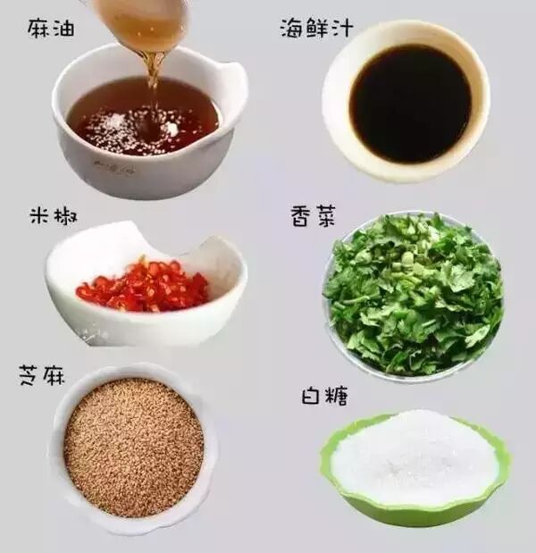 配料:麻油、海鲜汁、米椒、香菜、白糖、芝麻