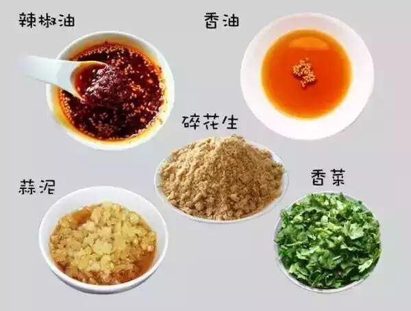 配料:辣椒油、香油、蒜泥、碎花生、香菜
