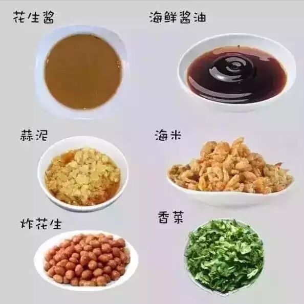 配料:花生酱、海鲜酱油、蒜泥、海米、炸花生、香菜末