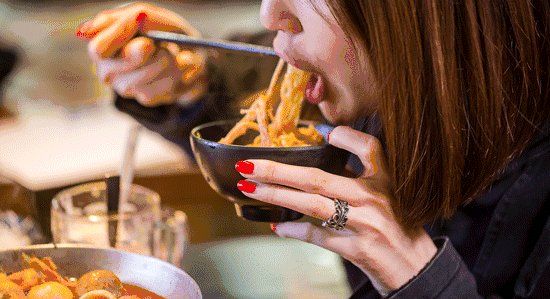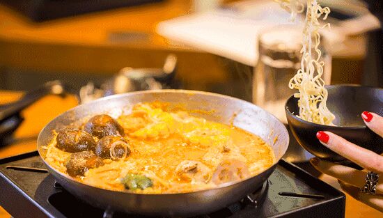 把生鸡蛋搅拌到汤底,拌着各种食物一同吃进去