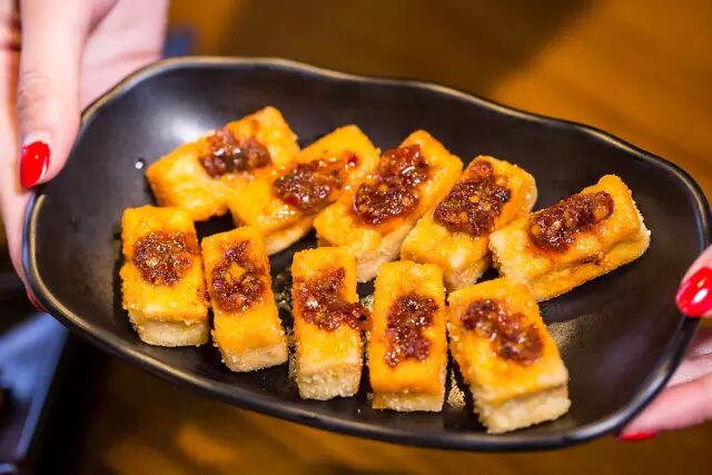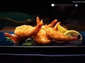 黄金蝴蝶虾色泽金黄,蘸上酱料