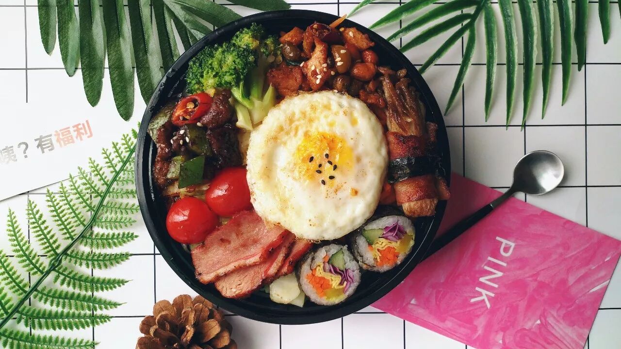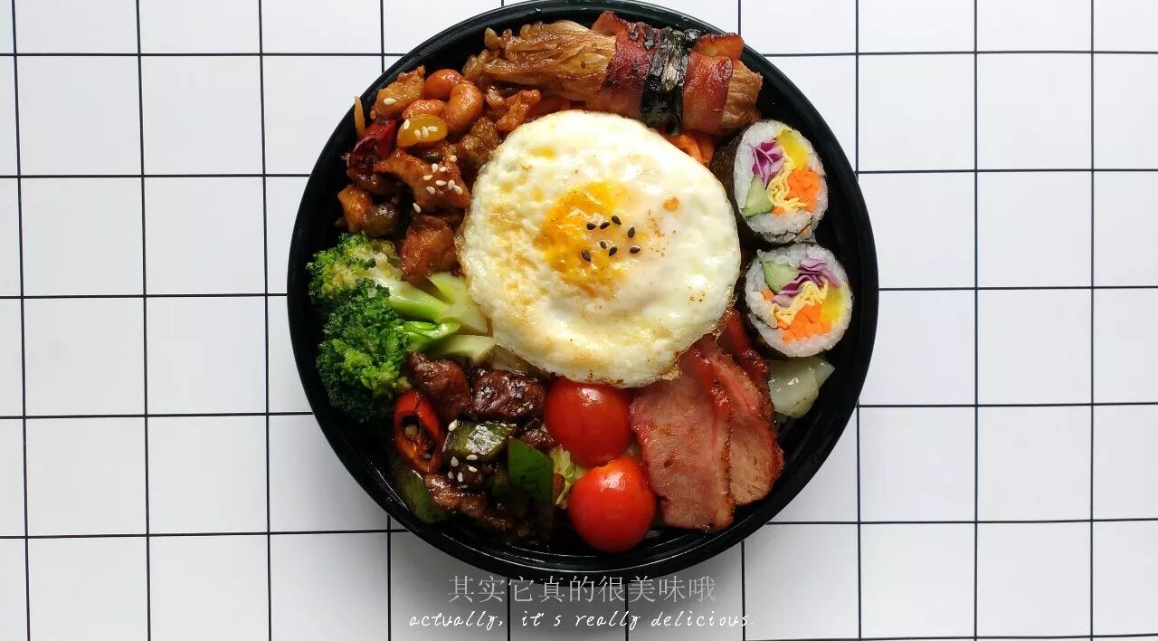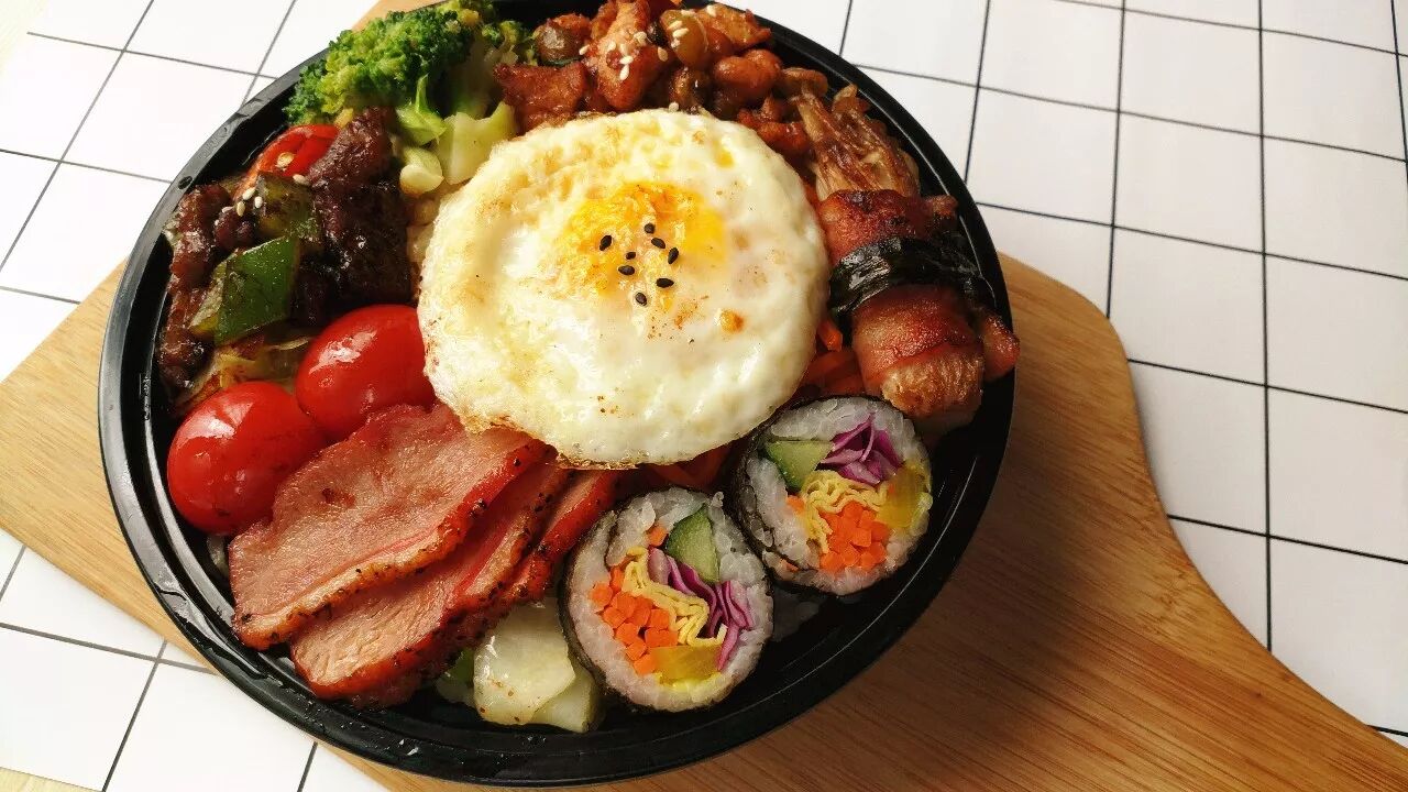 主食:黑椒牛柳,金针菇培根卷,太阳蛋,烟熏鸭胸肉,紫菜包饭,西兰花,宫保鸡丁,小番茄