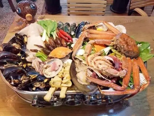 当服务员端了一个“澡盆子”走过来的时候,梭子蟹、海虹、花蛤、小龙虾、大章鱼,各种见过的没见过的海鲜…