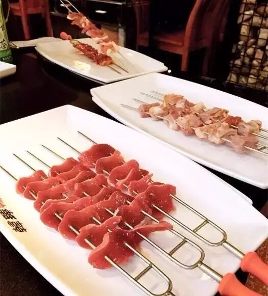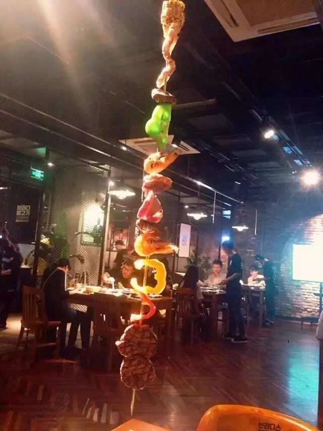 很有风格的一家烧烤店,又是彩色的工业风格,以彩色铁丝网,钢板为主,黄色的射灯照在食物上,色彩丰富的地方也让人食欲大增。招牌1M烤肉(牛肋条、五花肉、猪梅肉、虾、蔬菜等)这个大串噱头很足,上来之后是挂在桌子顶上的,服务员会过来帮你烤,肉类和蔬菜彩椒组合在一起,漂亮,味道也超赞。