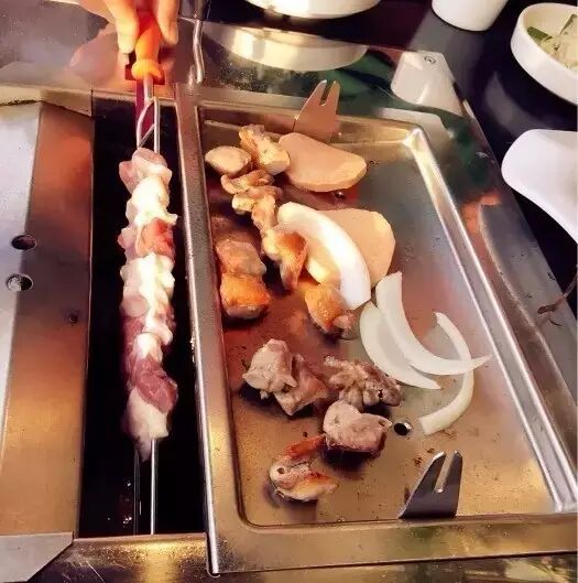 与一般的韩式烤盘不同,被第一眼看到的巨大石盘震住了,整个桌面几乎就是一个石头烤盘,桌边放着餐前小菜。肉质也是惊艳的存在,雪花分明。
