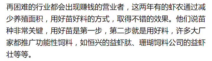 2013年至2015年的养殖情况很不好。以虾塘为生的当地农民又不愿意放弃,只能缩小经营,大部分虾农都有赌小的心理,放弃了大部分虾塘的养殖,这几年的经营不顺,造成伤痕累累,实在是养不起了,现在在养的虾塘,不到三成,有的局部区域,甚至十塘九空。而且大部分从以前的每年2-3造改为一造,只养冬棚虾,中造养殖的虾塘不到一成,这点从这两年整个市场的饲料销量可以看出来,有的厂家的业务员表示,今年到现在为止,虾料的销量只有300多吨,而其中还有100多吨是去年冬棚虾的销量。
