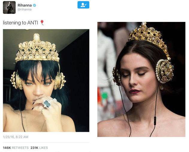 之前Riri在Ins上传了一张戴着Dolce&Gabanna天价耳机的自拍,获得了14万的转发和23万赞,12个小时后,Dolce&Gabanna宣布这款耳机自此全球绝版..
