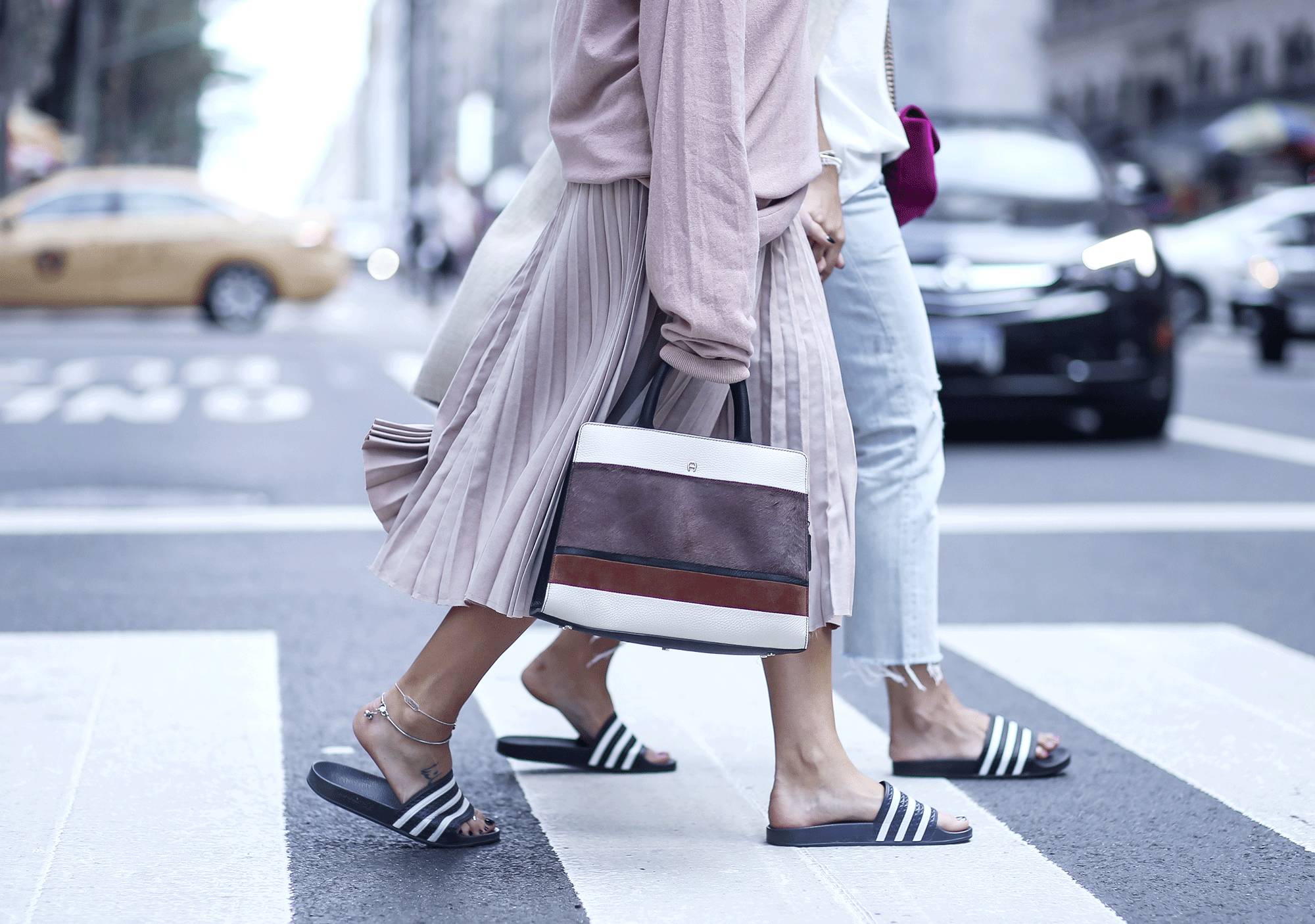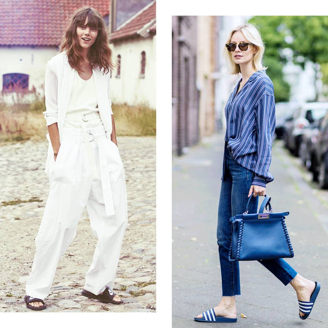 这种缎面的蝴蝶结拖鞋,也是需要混搭一点的风格来展示,最好再多一点街头风格。