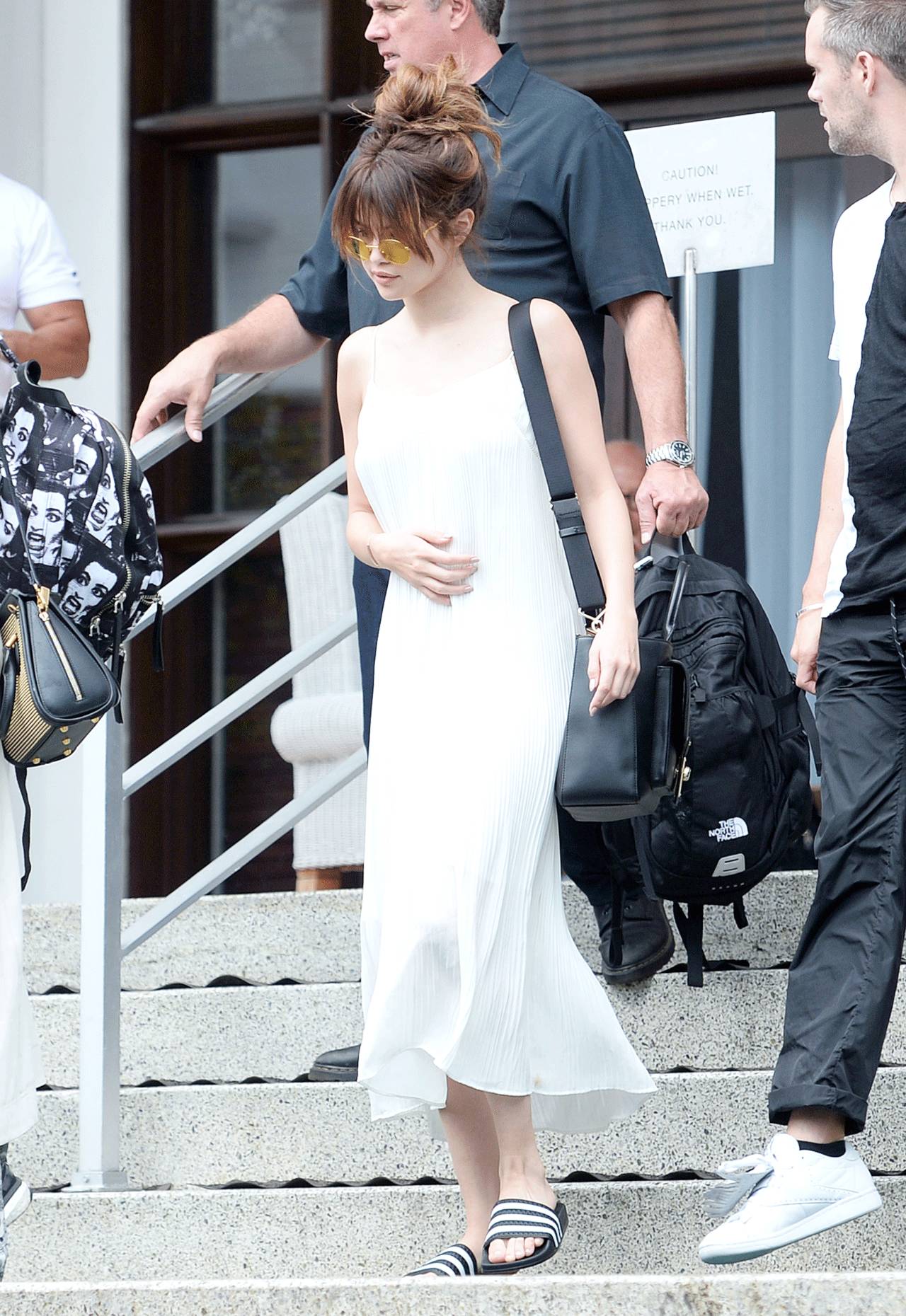 比如像Gigi Hadid(吉吉·哈迪德)一样搭配运动短上衣,或者像天后本人一样穿运动风外套,这样才能削弱毛毛拖鞋本身的居家感。