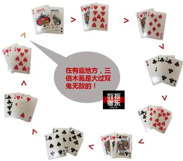 牌型大小: 双鬼无敌 > 双倍天公9(天公9) >双倍天公8 (天公8) > 八倍同花顺 > 五倍三同张 > 四倍顺子 >9点>8点>7点>6点>5点>4点>3点>2点>1点>“木虱”(依次如下图所示)