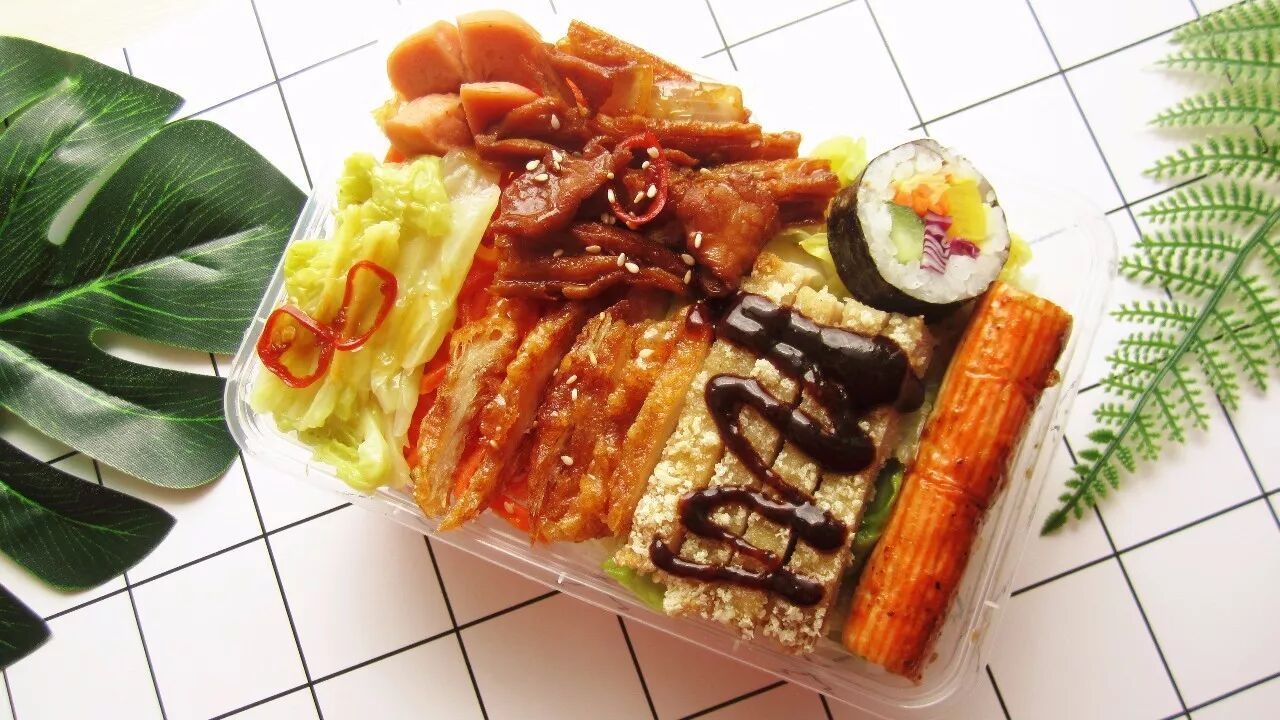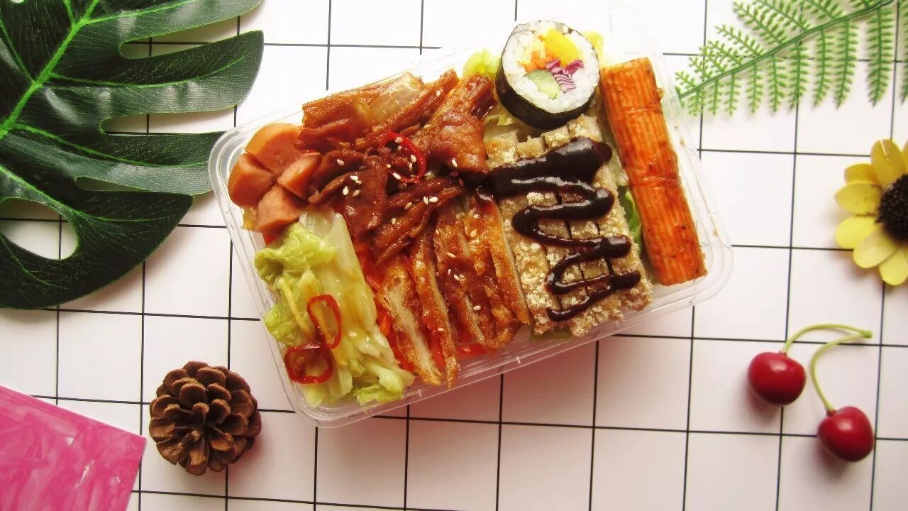 主食:秘制叉烧,高汤瘦肉娃娃菜,腐竹土豆焖肉,香辣蟹柳,紫菜包饭,黑椒猪扒,波波肠