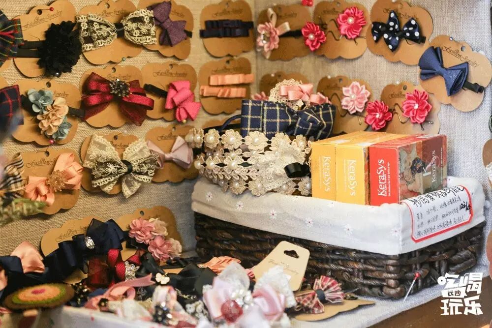 商品五花八门,有小盆栽、耳饰、化妆品、挂件、精致文具等,商品丰富,玲琅满目,像是一个个小小世界。