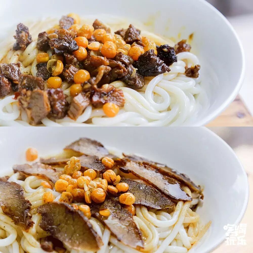 再撒上点黄豆,米粉与大片牛肉搅拌在一起看起来特别有食欲,简单又实在!
