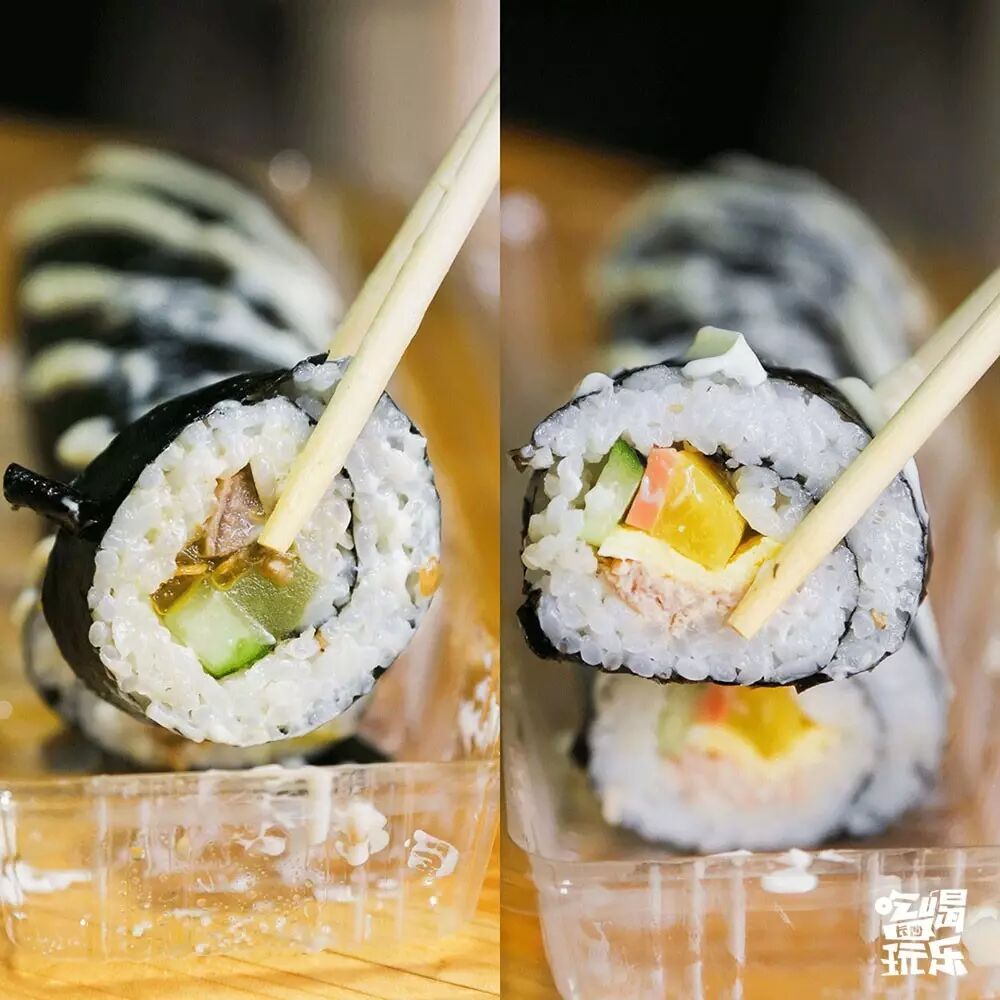 最受欢迎的就是原味和培根的紫菜包饭,米饭里加入了芝麻油和白芝麻,很香软。