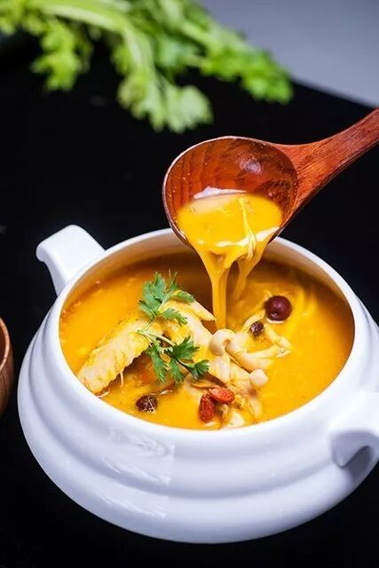 南瓜鸡汤在视觉上很有吸引力,汤头浓稠馥郁,打碎的南瓜浆与小火慢煲两小时的鸡汤完美融合,入口鲜香回甘,鸡肉弹润适口,适中的火候使鸡肉既不会难于下齿又不会松散无味。对老年人和儿童也不会造成负担。