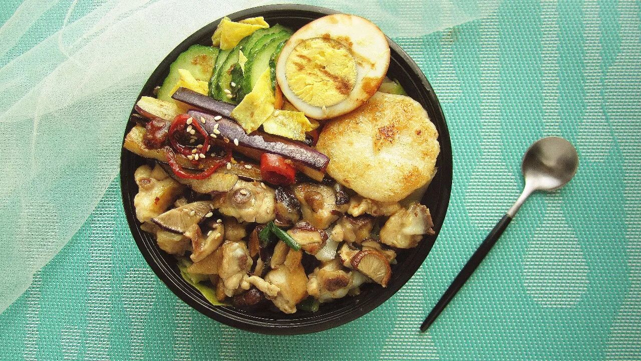 主食:冬菇蒸鸡,肉沫茄瓜,香煎飞碟,青瓜炒蛋,卤蛋