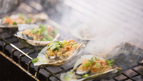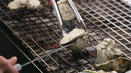 高温的木炭烤得生蚝里的汁水不断沸腾