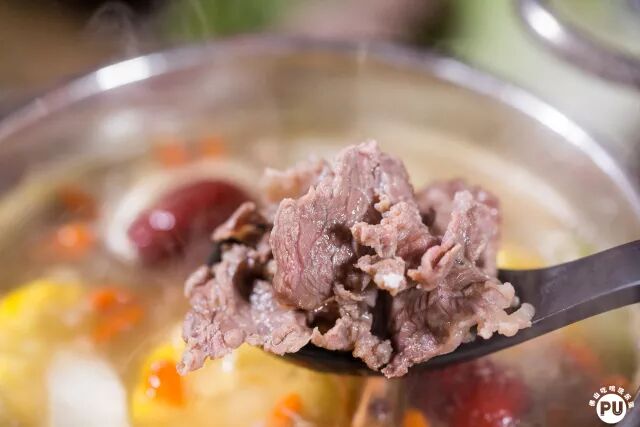 店里的嫩牛肉是由汕头新鲜运来的,涮5-8秒就好了,咀嚼之中肉汁充斥口腔