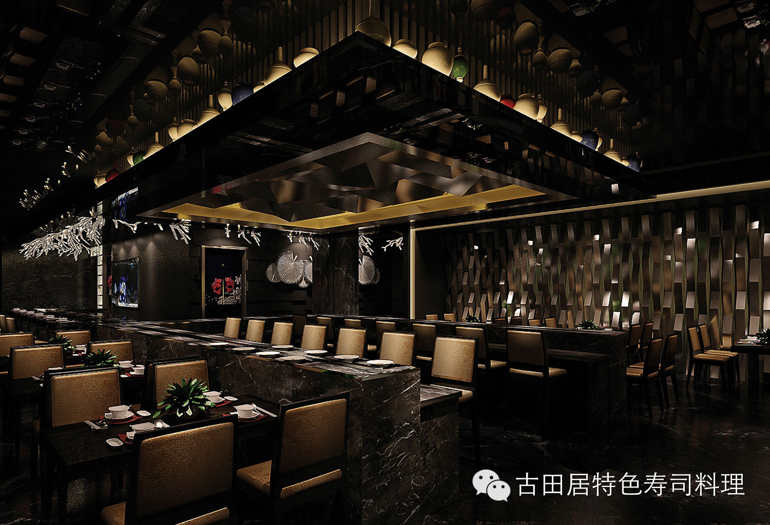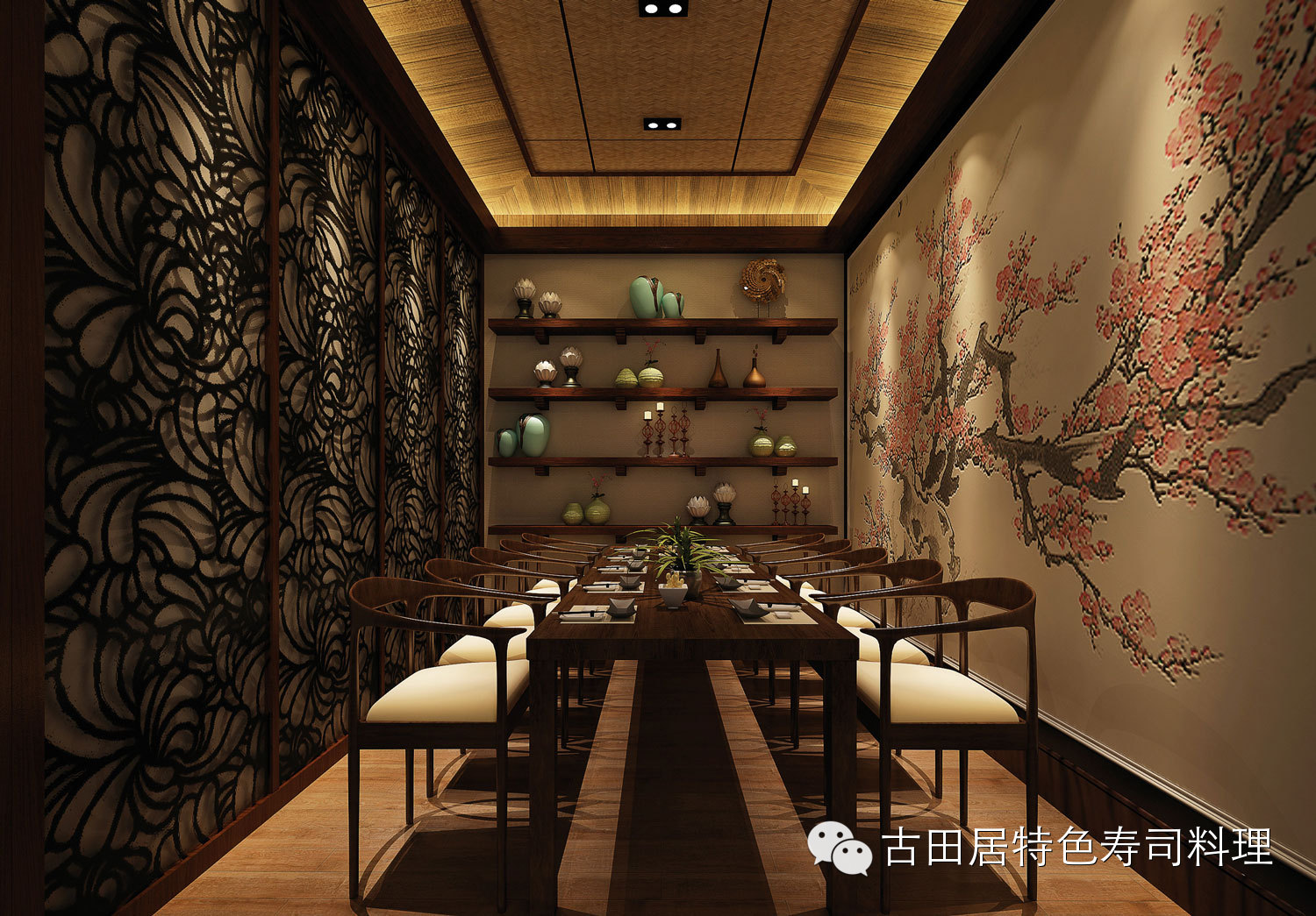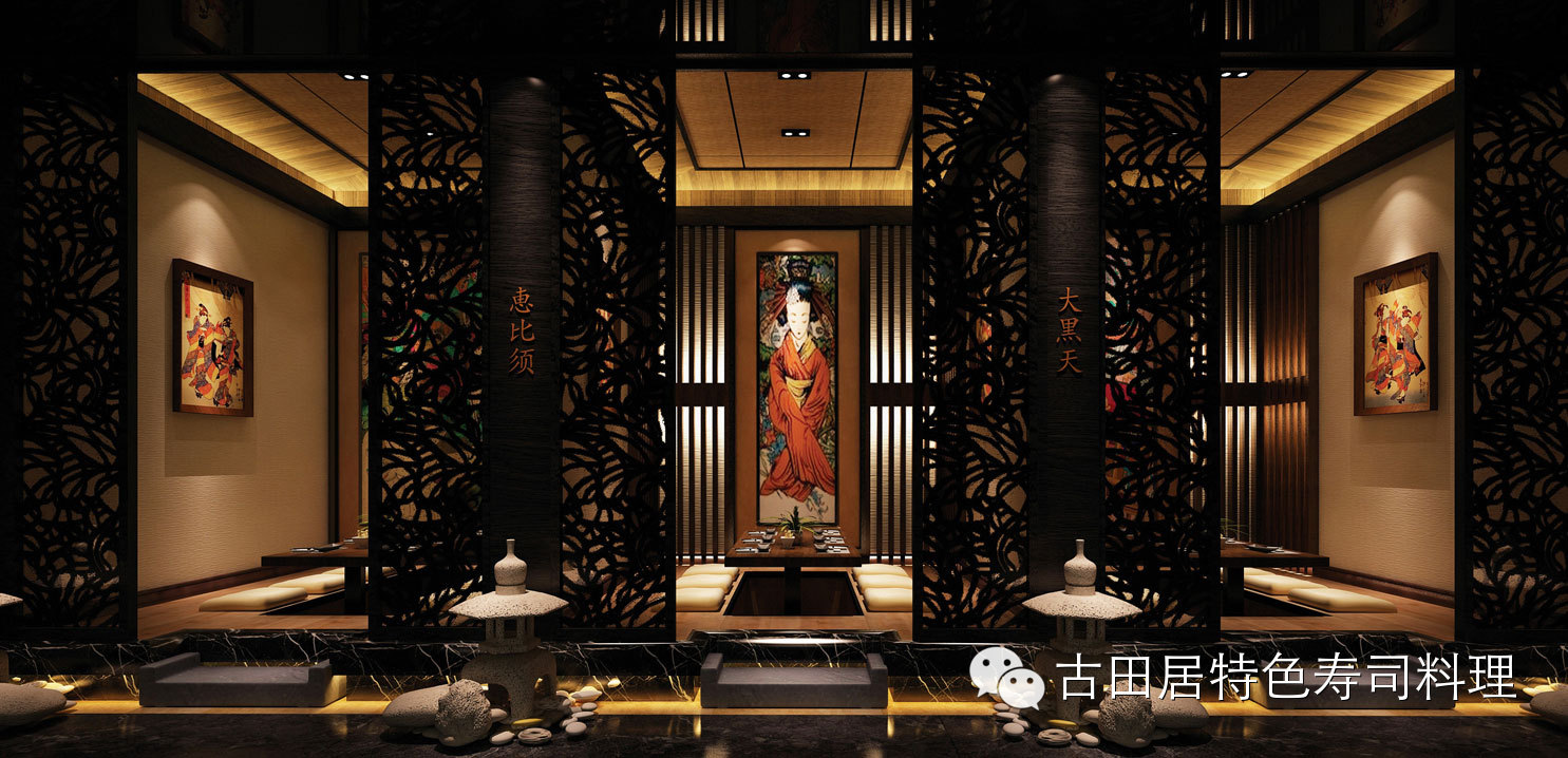 店内摆设具有浓厚的日本民族特色,色彩沉稳且富有个性,散发日式和风与东方禅意,前所未有的舒适感让您享受美食的同时,能感受到一种平和典雅的意境。