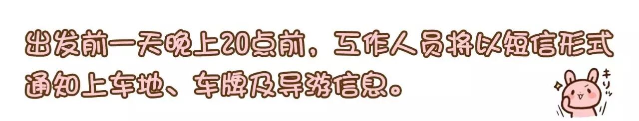 6.我社将按实际人数安排合适车型,并安排巴士座位,上车请对号入座;车牌号、座位号以及陪同联系方式将在出行前一天20:00点前以短信形式通知,敬请留意;如您在出行前一天20:00尚未收到短信,请速来电咨询。