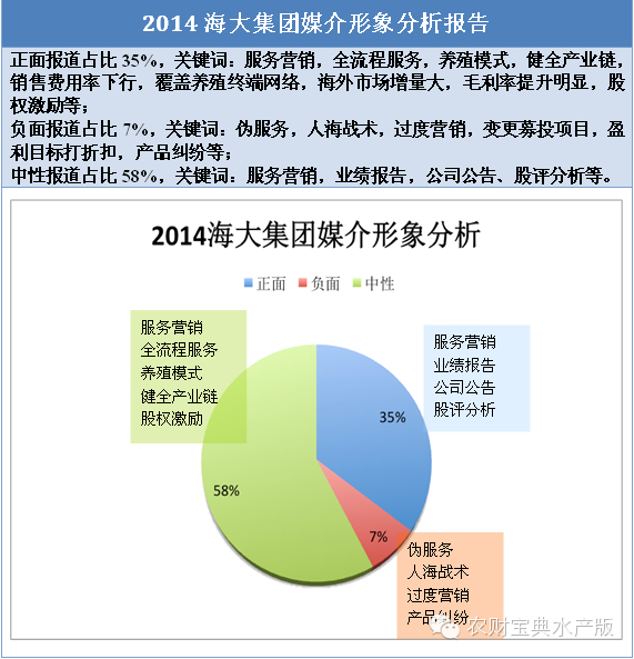 根据关键词交叉搜索,对海大集团媒介形象做综合分析,可以发现一个颇为奇特的现象:在见诸公开媒体的所有关于海大的信息中,中性信息占比58%,主要关于公司公告、招聘信息、股评分析等;正面信息占比35%,相关度较高的关键词为“服务营销”、“全流程服务”、“养殖模式”、“健全产业链”、“覆盖养殖终端网络”等等,其主要信源为上市公司年报、证券分析师报告、行业媒体专访等;负面信息占比7%,相关度较高的关键词是“人海战术”、“伪服务”、“过度营销”及个别产品纠纷等,其主要来源为行业论坛、行业媒体报道及地方论坛等等。