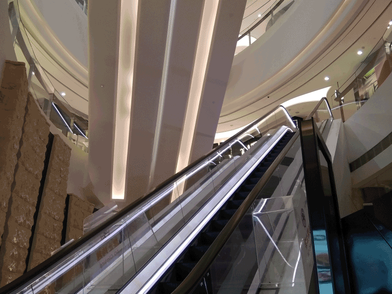 这是从负三层仰望负一负二层和一层的视角,可以看到这里的手扶梯都是有错开一定角度的。