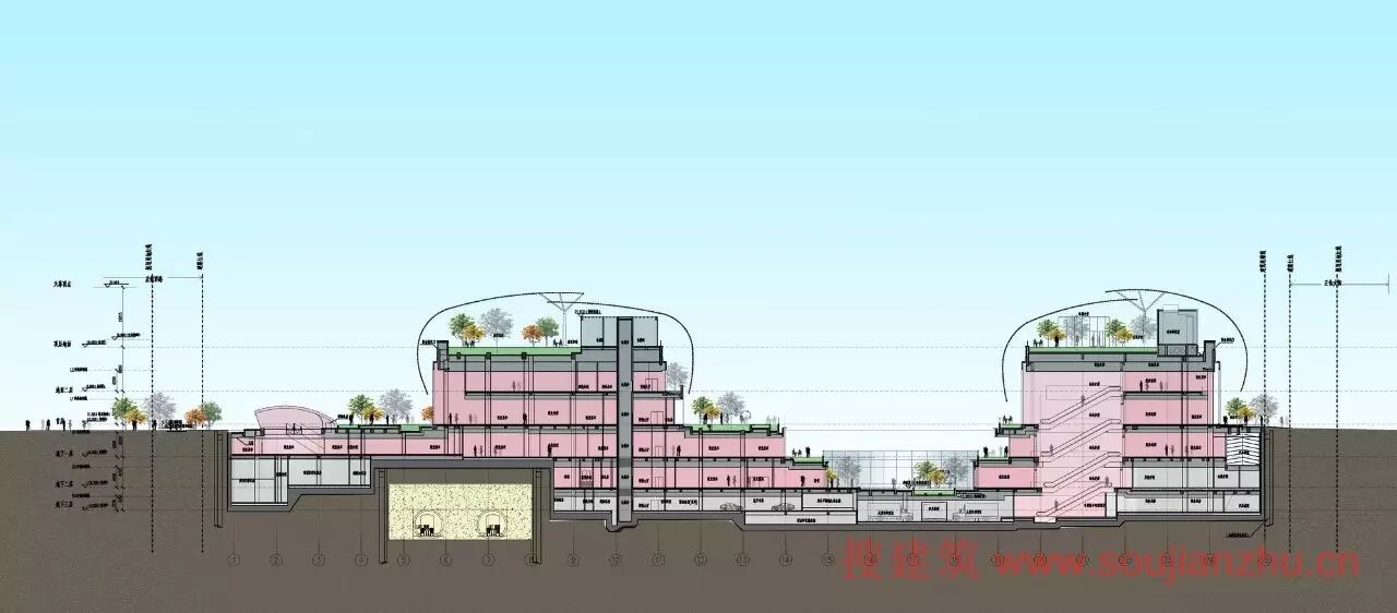 从中环广场的南北轴横切设计图看,东西方向的建筑群依次是高——低——高排列的。