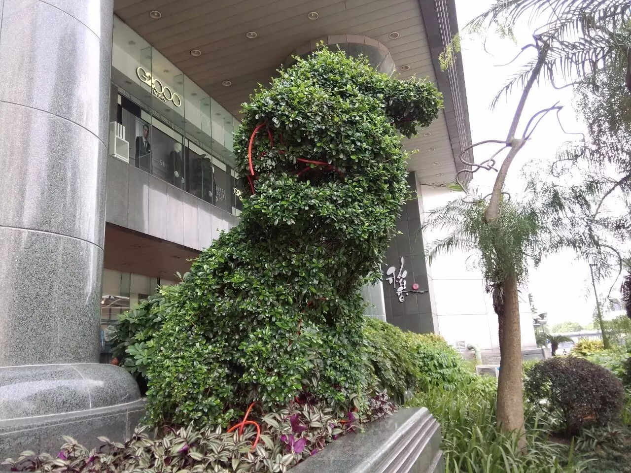 天河城广场的东门两旁布置了两棵狮子造型的植物。这在风水学上叫守门狮,一般见于大型银行的门口两旁。