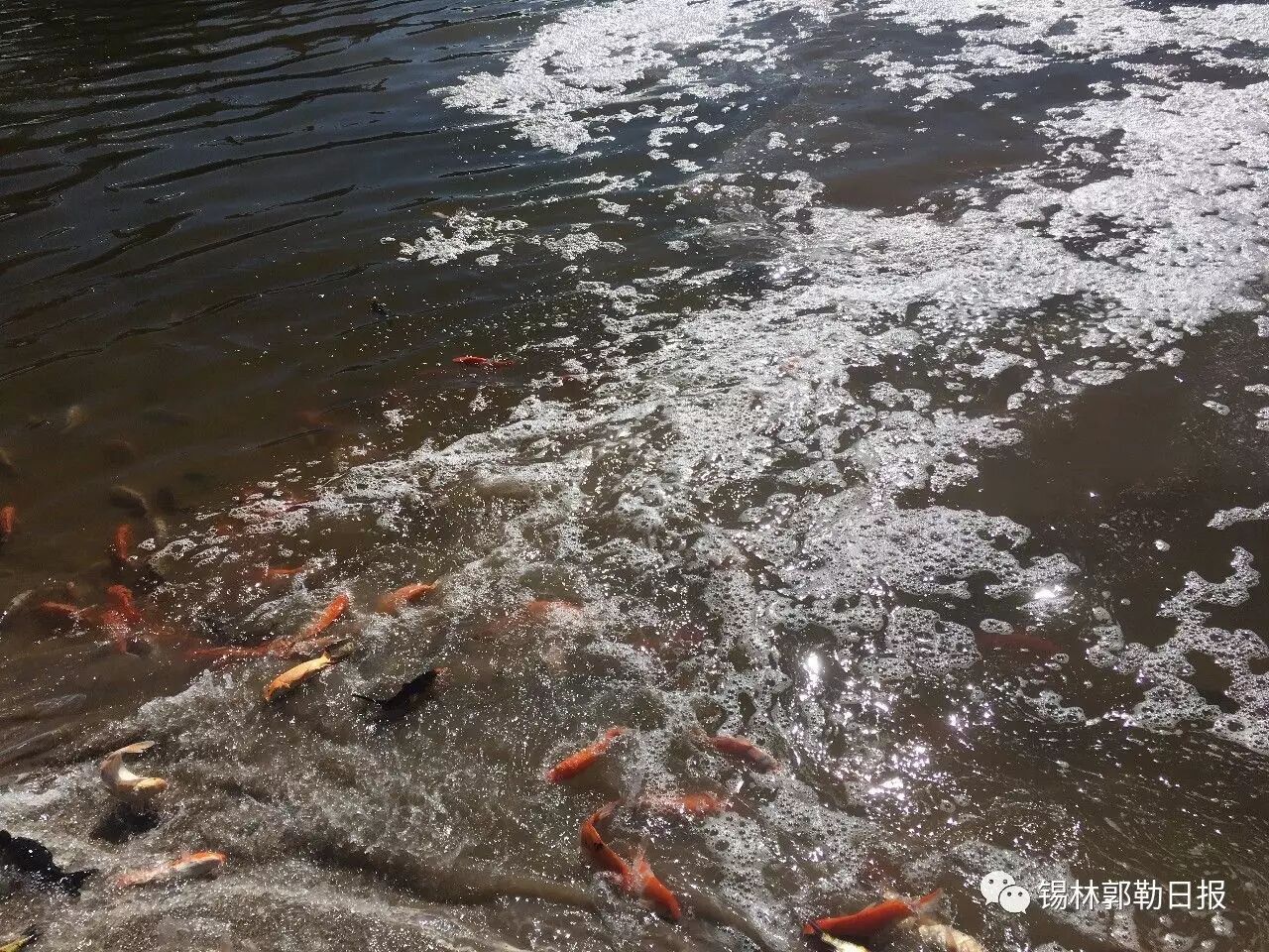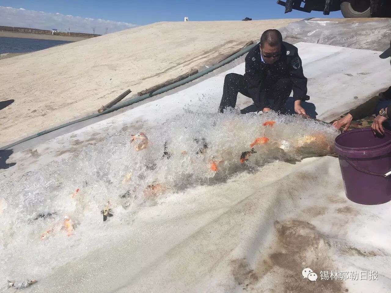 5月12日上午, 锡林浩特市林水局工作人员将2万余尾锦鲤投放于锡市锡林河下游湿地人工湖,这些五彩斑斓的观赏鱼吸引了市民纷至沓来,为湿地公园景区再添新亮点。这是锡市林水局继去年之后第二次在此投放景观鱼,是推进生态建设,加强环境综合治理的一项重要举措。
